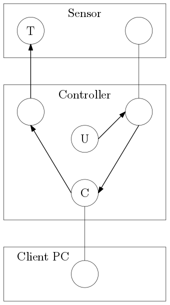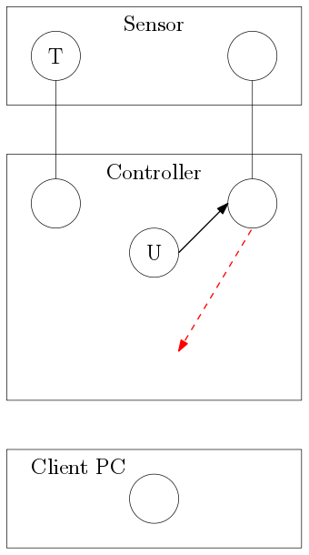 So, after finding that out, the big question is still unanswered: What's happening here? Why does the presence of a client affect internal communication to Switchboard T? To answer this question, we have to understand the topology of the system. The following picture shows the three physical devices involved, depicted as large rectangles: