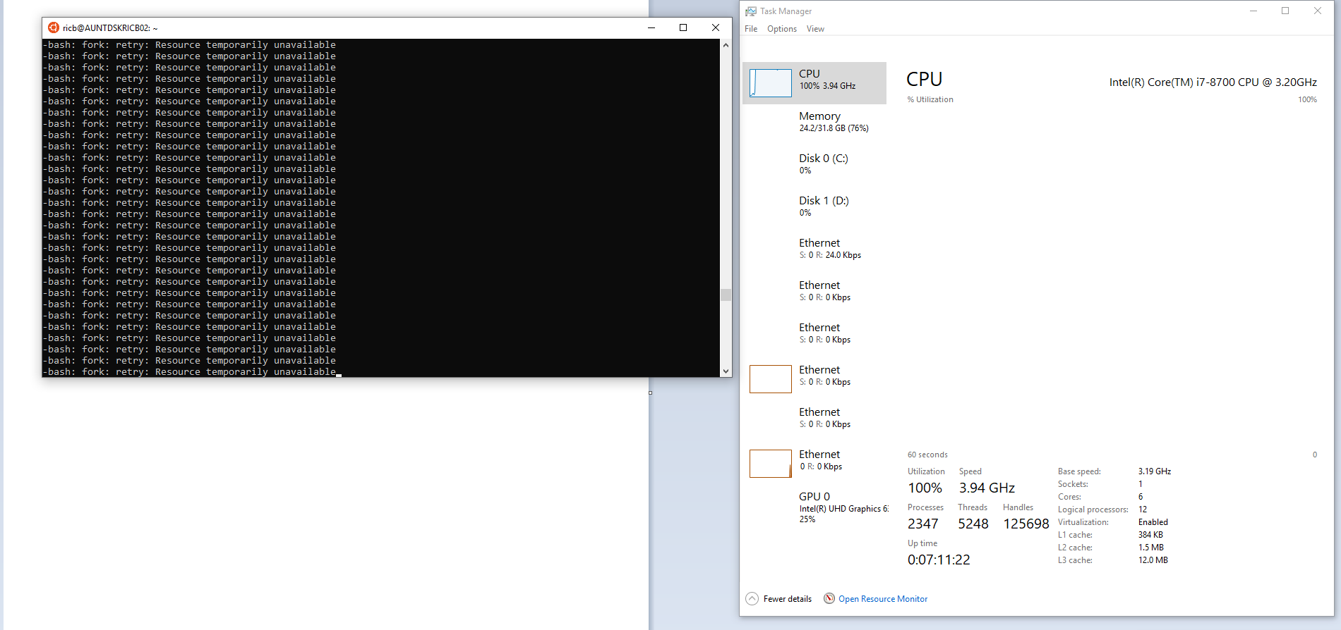 I was able to take a screenshot, but I had to press the print screen button twice for it to do anything. After that, the system seemed to have regained some stability. Memory usage was still around 24GB. I closed the WSL console and told the co-worker that the problems definitely appeared in Windows, but I was still unsure who won. A couple of seconds later, my mouse pointer froze and so did the entire machine. A hard reset was necessary to get the machine responsive again. The result is clear, I lost that beer. Well played.