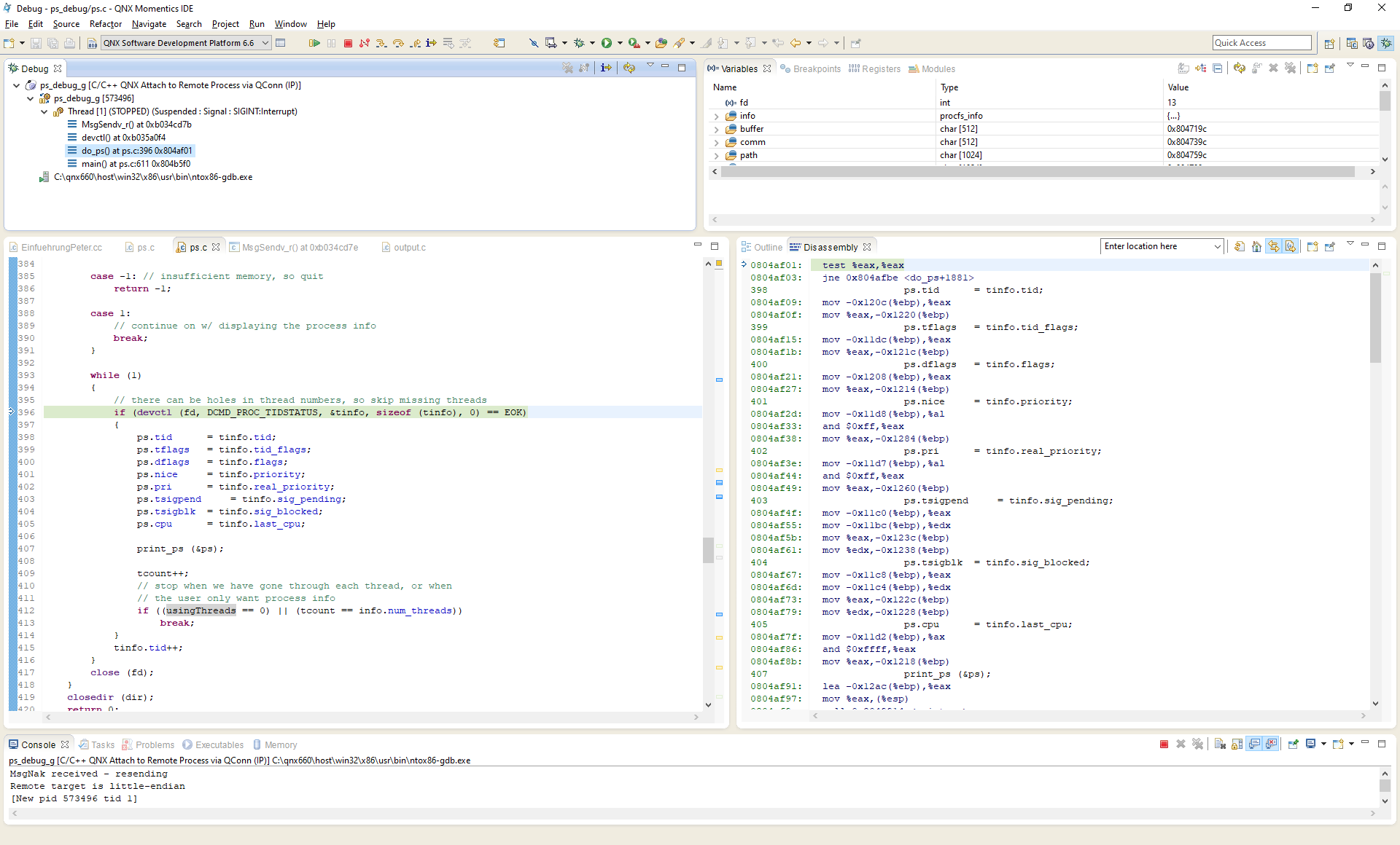 I also verify this hypothesis by halting the ps process in the debugger, killing the process whose threads we are about to inspect and resuming ps and it hangs in precisely the same way. This is what it looks like in the QNX Momentics IDE: