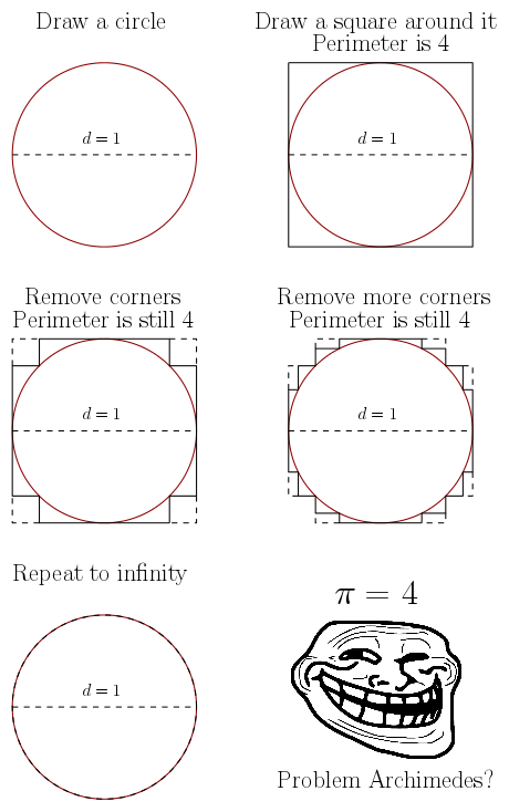 A couple of years ago, I came across a picture of a mathematical proof that showed that the constant Pi is equal to 4. The remarkable thing was that the error in the reasoning wasn't obvious at all, even after taking university level calculus lessons, it stumped me for a moment. The false proof goes as follows: