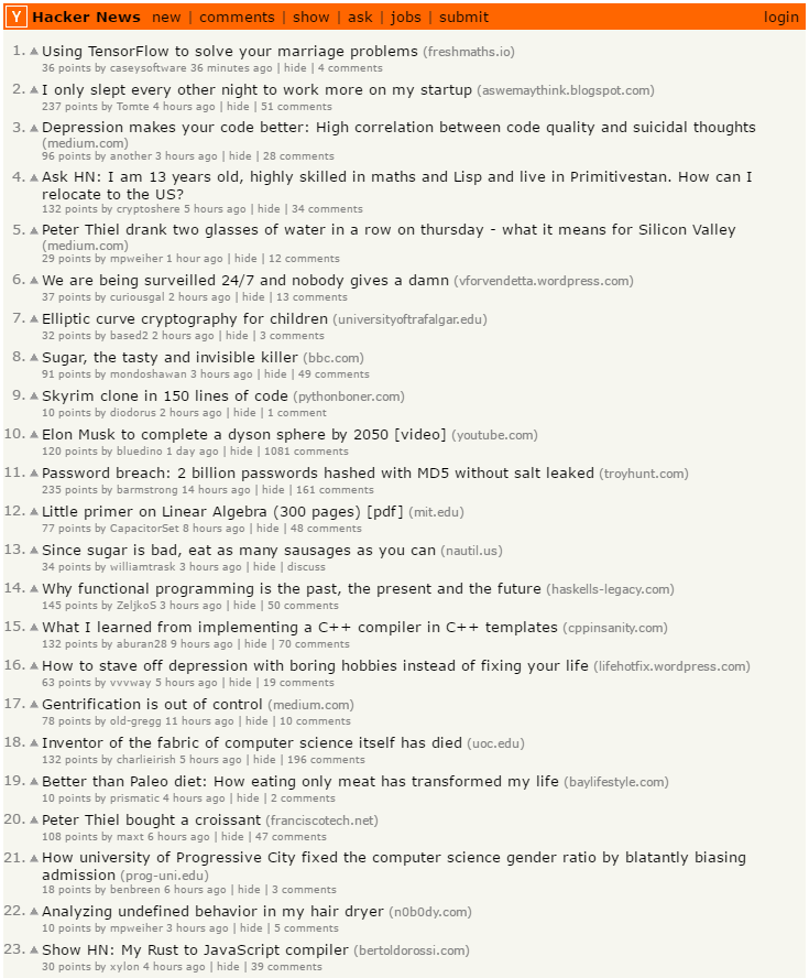 This evening, after I clicked my Hacker News bookmark to get my daily fix of technology news, I was completely stumped. What I found on the front page was just so weird! Is this a website full of technology enthusiasts or workaholics with delusions of grandeur?